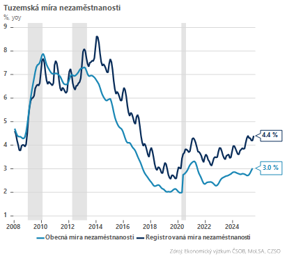 Střih do poloviny roku 2025, kdy je tuzemská míra nezaměstnanosti stále nejnižší v EU, ale postupně šplhá směrem vzhůru. V případě všeobecné míry nezaměstnanosti teprve v posledních měsících (aktuálně na 3 %), v případě podílu nezaměstnaných (data z úřadu práce) je tento trend patrný již druhým rokem. Červencová úroveň 4,4 % je nejvyšší za posledních devět let, přičemž na vině nejsou jen sezónní faktory, ale také plíživé ochlazování trhu práce.