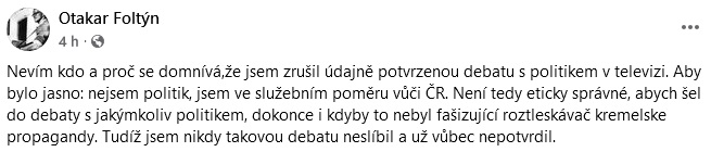 Otakar Foltýn se odmítl zúčastnit v televizní debatě na Nově s předsedou strany PRO Jindřichem Rajchlem. Plukovník se poté vzmohl jen "facebookový" úhybný manévr, kdy Rajchla nazval "roztleskávačem prokremelské propagandy". Odpověď přišla záhy.