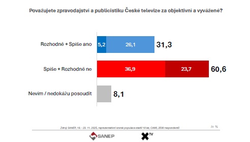 Exkluzivní průzkum společnosti SANEP pro televizi XTV zkoumal, jak Češi vnímají veřejnoprávní média. Na reprezentativním vzorku 2 500 obyvatel ČR a zjišťoval důvěru v Českou televizi, Český rozhlas a Českou tiskovou kancelář, hodnocení jejich objektivity i postoje k financování a možnému sloučení institucí. Šetření proběhlo mezi 18. a 23. listopadem.