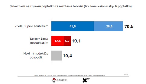 Průzkum se dotkl i otázky poplatků za televizi a rozhlas, které jsou v českém prostředí tradičně citlivým tématem. Agentura SANEP zjišťovala, jaký je postoj veřejnosti k návrhu na jejich zrušení.
