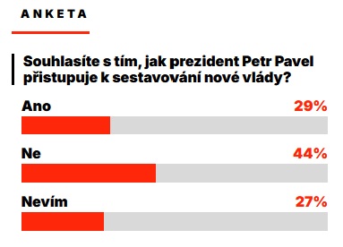 Čtenářská anketa serveru Prvnizpravy.cz proběhla od 28. listopadu do 2. prosince 2025 a zúčastnilo se jí 22 266 hlasujících. Výsledky ukázaly, že veřejnost je k postupu prezidenta Petra Pavla při sestavování nové vlády výrazně kritická. Podporu mu vyjádřilo 29 procent respondentů, nesouhlas uvedlo 44 procent a 27 procent hlasujících přiznalo, že si není jistých. Celkový obraz naznačuje, že prezidentův přístup vyvolává rostoucí pochybnosti.