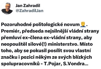 Zahradil hovoří o "pozoruhodném politologickém novumu" - podle jeho názoru premiér selhal ve snaze posílit svou vlastní pozici a značku. Proč, ptá se Zahradil, by premiér nevyužil příležitost a nevsadil na někoho ze svých nejbližších spojenců, jako je Tomáš Pojar nebo Alexandr Vondra? Namísto toho, aby podpořil svou stranu a upevnil její vliv, premiér se uchyluje k záchraně ministra z jiné, dříve vládní strany. Proč se tedy premiér rozhodl nevyužít šanci na konsolidaci moci uvnitř svého vlastního kabinetu?