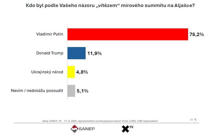 Nejvýraznější a zároveň nejkontroverznější výsledek se týká otázky, kdo bude považován za „vítěze summitu“. Až 78 procent respondentů označilo za vítěze Vladimira Putina. Tento údaj je mimořádně silný a odráží jednak hluboký pocit, že Rusko vstupuje do jednání z pozice síly, jednak že případné kompromisy budou interpretovány jako ústupky na jeho straně. Naopak jen necelých 12 procent veřejnosti věří, že hlavním vítězem může být Donald Trump, a pouhých pět procent připisuje tuto roli Ukrajincům.