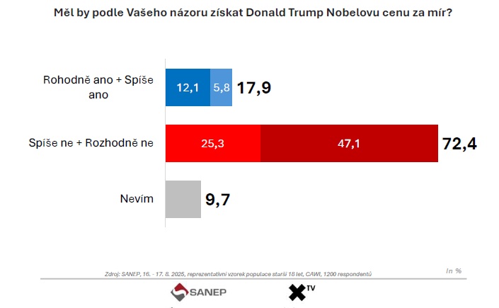 Zajímavým doplňkem je i otázka na potenciální udělení Nobelovy ceny míru Donaldu Trumpovi. Jen čtvrtina respondentů by tento krok podpořila, téměř polovina jej jednoznačně odmítá a více než čtvrtina nedokáže zaujmout stanovisko. Tento výsledek reflektuje jednak obecně kontroverzní vnímání Trumpa v českém prostředí, jednak skepsi, že by jeho role skutečně vedla k udržitelnému míru. Pozitivní názor sdílí spíše menšina a opět se ukazuje, že česká veřejnost si uchovává kritický odstup k politickým gestům tohoto typu.