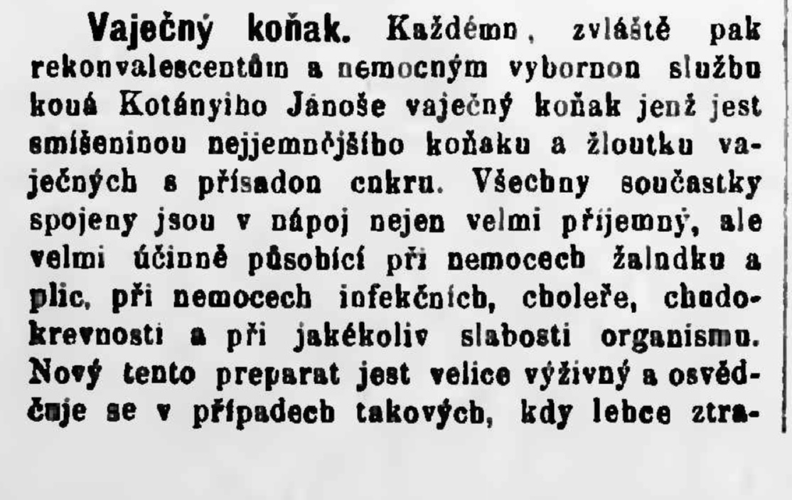 V dobové zprávě je vyzdvihována kvalita vaječného koňaku od Kotányiho Jánoše, který byl připravován z nejjemnějšího koňaku, vaječných žloutků a přísady cukru. Tento nápoj byl doporučován zejména rekonvalescentům a nemocným, protože díky své kombinaci složek představoval silně výživný a zároveň příjemný prostředek.